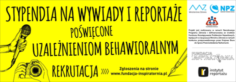 Interesuje cię problematyka tzw. „współczesnych uzależnień”? Chcesz o nich napisać reportaż? A może stworzyć pogłębiony wywiad? Jeśli tak, to właśnie ciebie szukamy! Już dziś możesz zgłosić się do projektu! Zapraszają: Fundacja Inspiratornia oraz Fundacja Instytut Reportażu.
