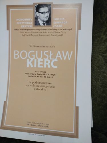 80. urodziny obchodził Bogusław Kierc, wybitny aktor, poeta, reżyser, dramaturg i pedagog, niedościgniony znawca poezji Juliana Przybosia (pamiętna książka Wzniosły upadek anioła, 1992) i Rafała Wojaczka. Widzowie mają w pamięci jego kreacje, niezrównaną, subtelną interpretację wierszy Adama Mickiewicza (Mój trup) i… wierszy Bogusława Kierca (Zaskroniec), o dawnych wyprawach w krainę filmu nie zapominając (Popioły Andrzeja Wajdy).