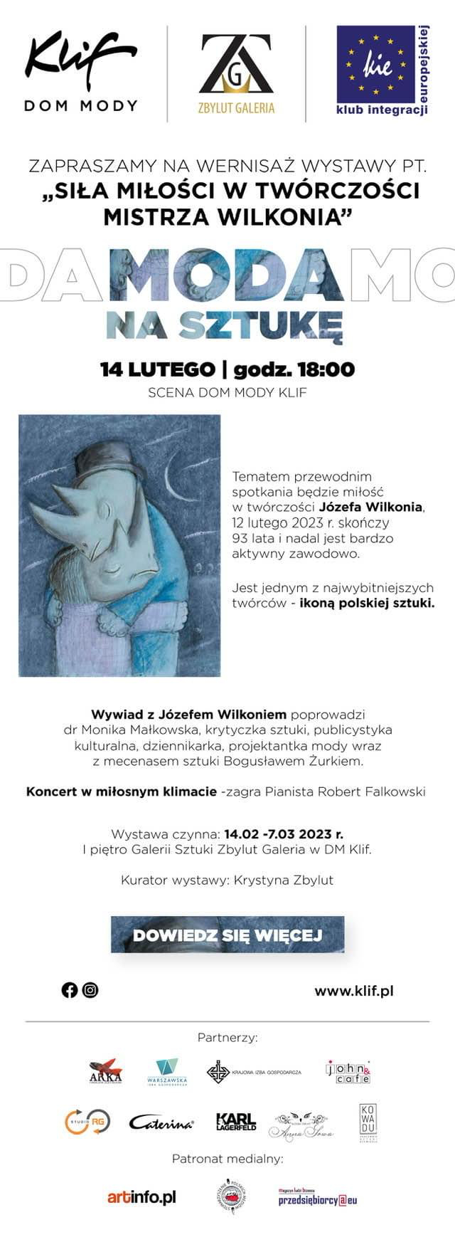 Szanowni Państwo, mamy ogromną przyjemność zaprosić Was na najprawdopodobniej najciekawszy wernisaż w Walentynki wystawy Józefa Wilkonia,14 lutego 2023 br. godz.18.00 z jednym z najbardziej cenionych polskich artystów współczesnych. Józef Wilkoń od wielu lat współpracuje z Galerią Sztuki Zbylut Galeria, która obecnie mieści się w DM Klif Warszawa.