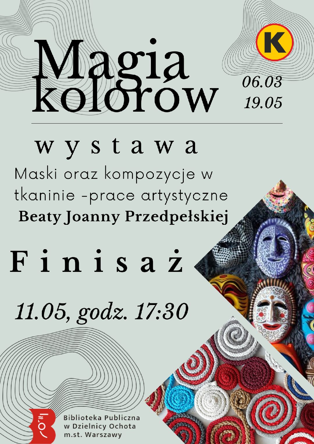 11 maja o godz. 17.30 odbędzie się finisaż wystawy „MAGIA KOLORÓW” – tkanin i masek inspirowanych sztuką Azji, Afryki, Wenecji i in. Zapraszamy na spotkanie z autorką prac, red. Beatą Joanną Przedpełską, która przy tej okazji opowie o swojej twórczości i łączeniu pracy dziennikarskiej (Polskie Radio, prasa krajowa i zagraniczna, korespondentka „Tygodnika Polskiego” z Melbourne) i artystycznej. Miejsce: Biblioteka PRZYSTANEK KSIĄŻKA, ul. Grójecka 42 (Wystawa eksponowana będzie jeszcze do 19 maja br.)