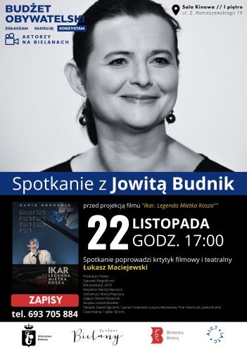 Kino za Rogiem w sali kinowej Biblioteki Publicznej im. Stanisława Staszica na Bielanach przy ul. Romaszewskiego 19 zaprasza 22 listopada 2023 na spotkanie z JOWITĄ BUDNIK, które poprowadzi krytyk filmowy i teatralny Łukaszem Maciejewskim, które poprzedzi projekcję filmu „Ikar. Legenda Mietka Kosza”. Początek imprezy o godz. 17.00. Wstęp wolny.