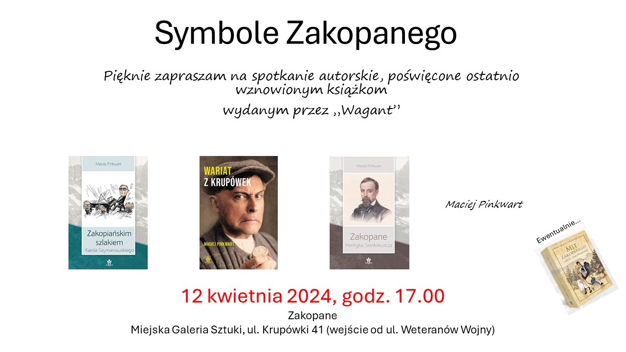 Mowa będzie o najnowszych książkach Macieja Pinkwarta: „Zakopiańskim szlakiem”, „Wariat z Krupówek”, „Zakopane Henryka Sienkiewicza”, a także (być może) o imponującej księdze „Mit Zakopanego i mity zakopiańskie”.