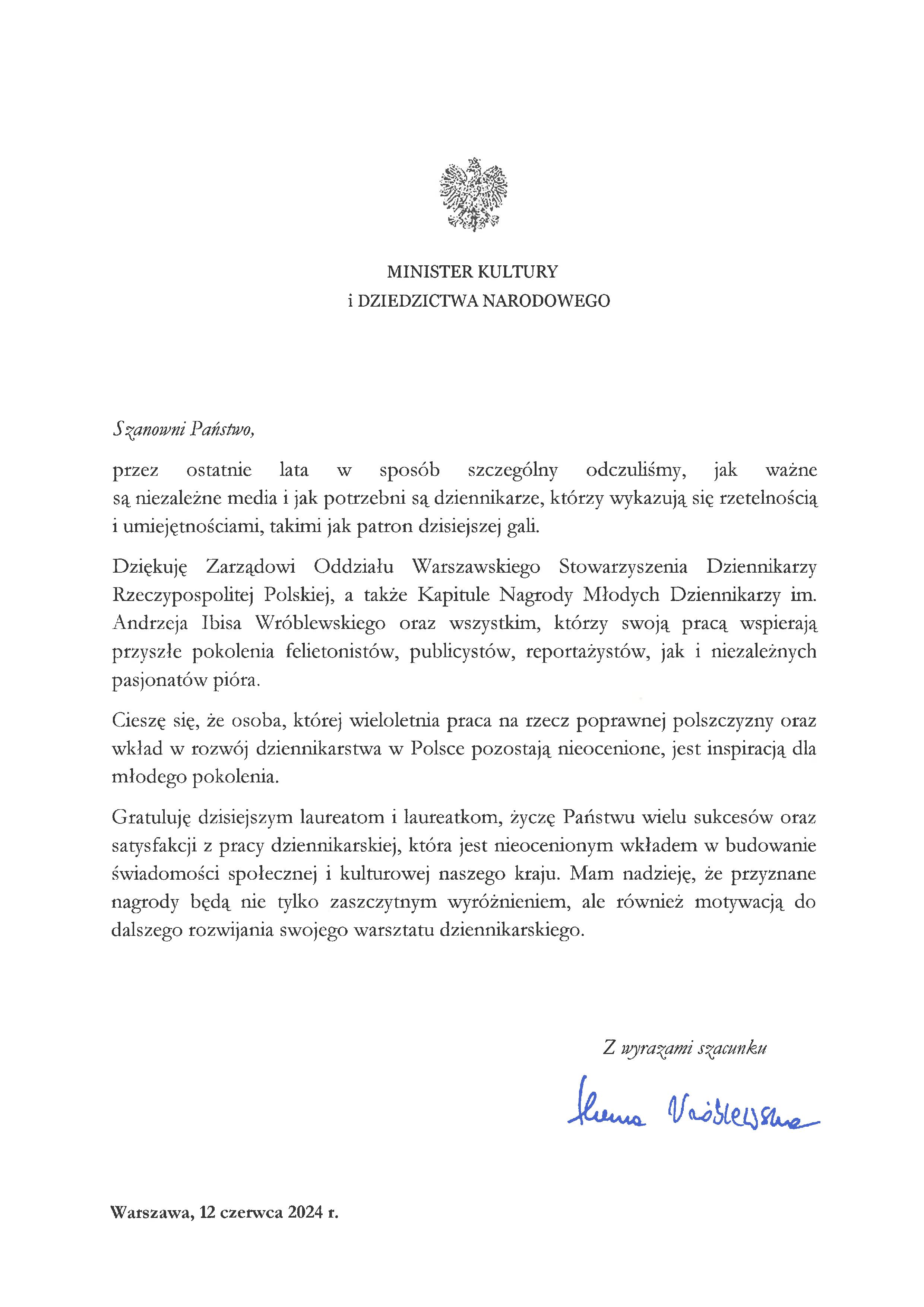 12 czerwca 2024 r. w Domu Dziennikarza przy ul. Foksal 3/5 w Warszawie odbyła się uroczysta Gala Nagrody Młodych Dziennikarzy im. Andrzeja „Ibisa” Wróblewskiego. Nagroda Ibisa została ustanowiona przez Oddział Warszawski Zarządu Stowarzyszenia Dziennikarzy Rzeczypospolitej Polskiej z myślą o szczególnym wyróżnianiu młodych dziennikarzy związanych ze stolicą i Mazowszem. Galę prowadziła redaktor Zofia Czernicka. Wydarzenie uświetnił mini-koncert wybitnej piosenkarki i kompozytorki Elżbiety Wojnowskiej, wdowy po Andrzeju „Ibisie” Wróblewskim.
