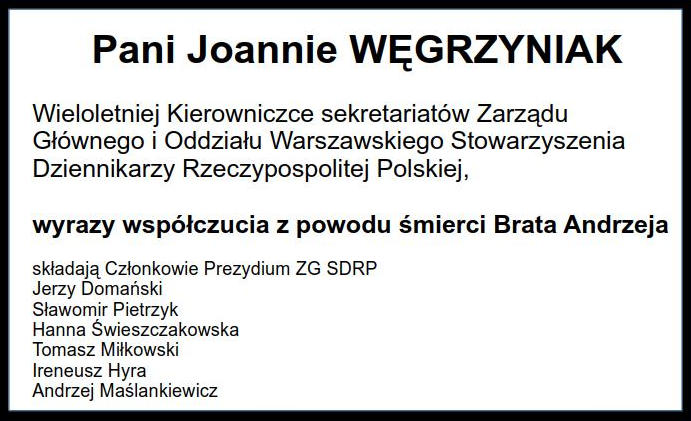 Drogiej Koleżance Joannie Węgrzyniak składamy wyrazy serdecznego współczucia w związku ze śmiercią BRATA. Zarząd Oddziału Warszawskiego SDRP.