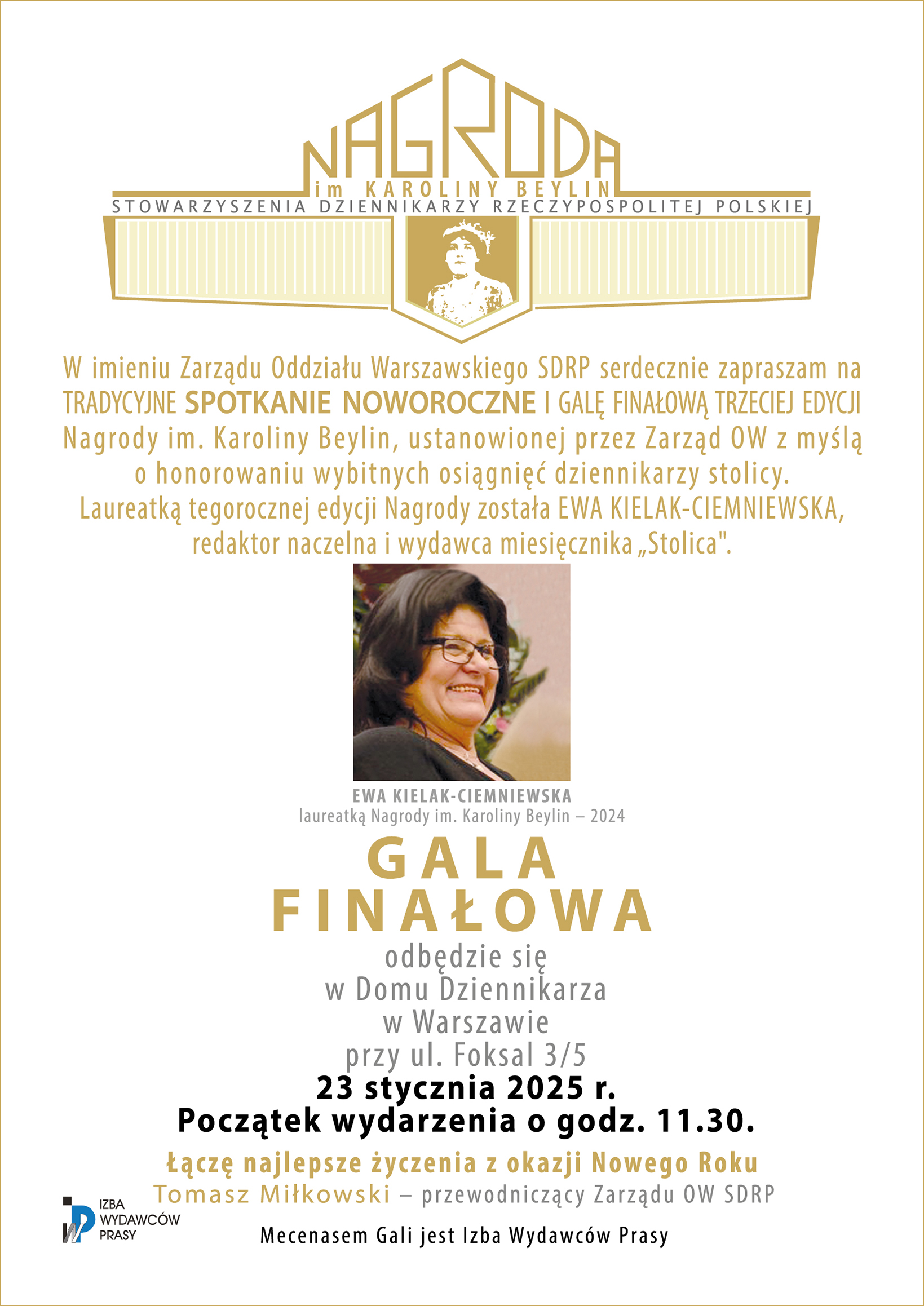 W imieniu Zarządu Oddziału Warszawskiego SDRP serdecznie zapraszam na tradycyjne spotkanie noworoczne i galę finałową trzeciej edycji Nagrody im. Karoliny Beylin, ustanowionej przez Zarząd OW z myślą o honorowaniu wybitnych osiągnięć dziennikarzy stolicy.